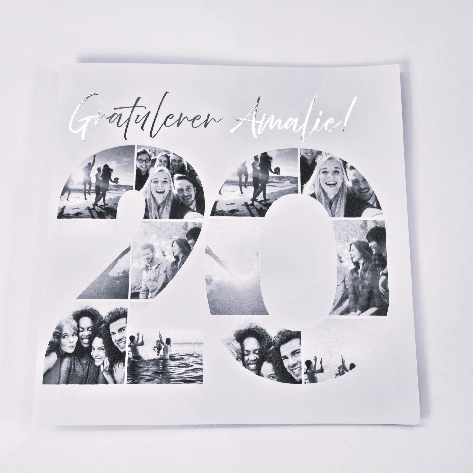 Personlig jubileumskort – “20 år” med bilder og skinnende folie