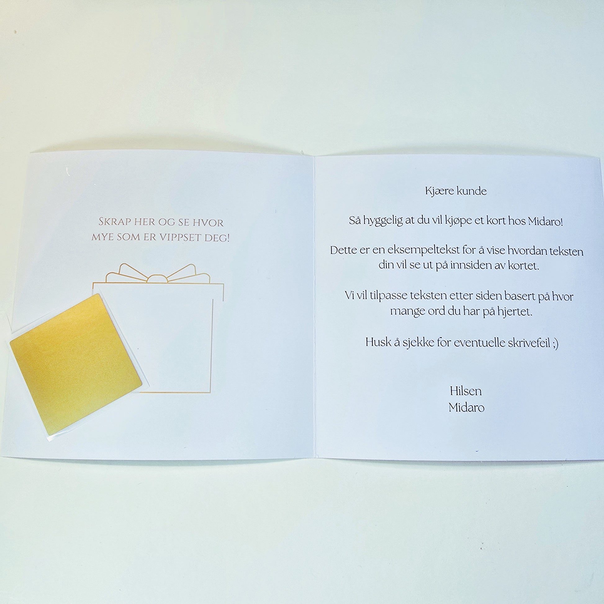 - Skal du vippse gave? Se bilde nr. 3, du kan velge vipps, så kommer kortet med "vipps tekst" og skrapeklistremerke. Skriv inn beløpet du vippser og fest skrapeklistremerket over for litt ekstra spenning.