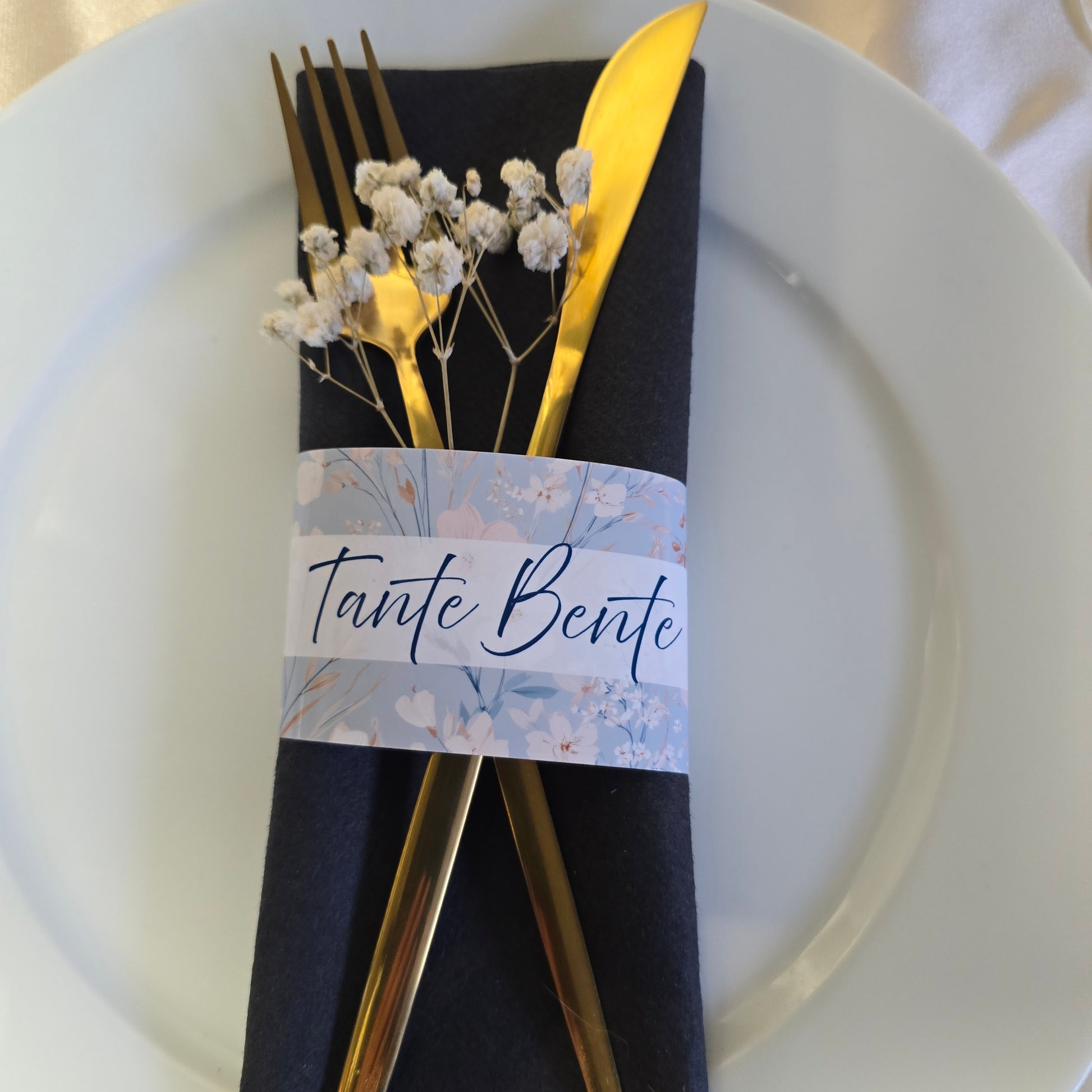 Gi borddekkingen et elegant og personlig preg med et serviettbånd med gjestens navn. Båndet legges rundt servietten og fungerer både som bordkort og dekorasjon på bordet.