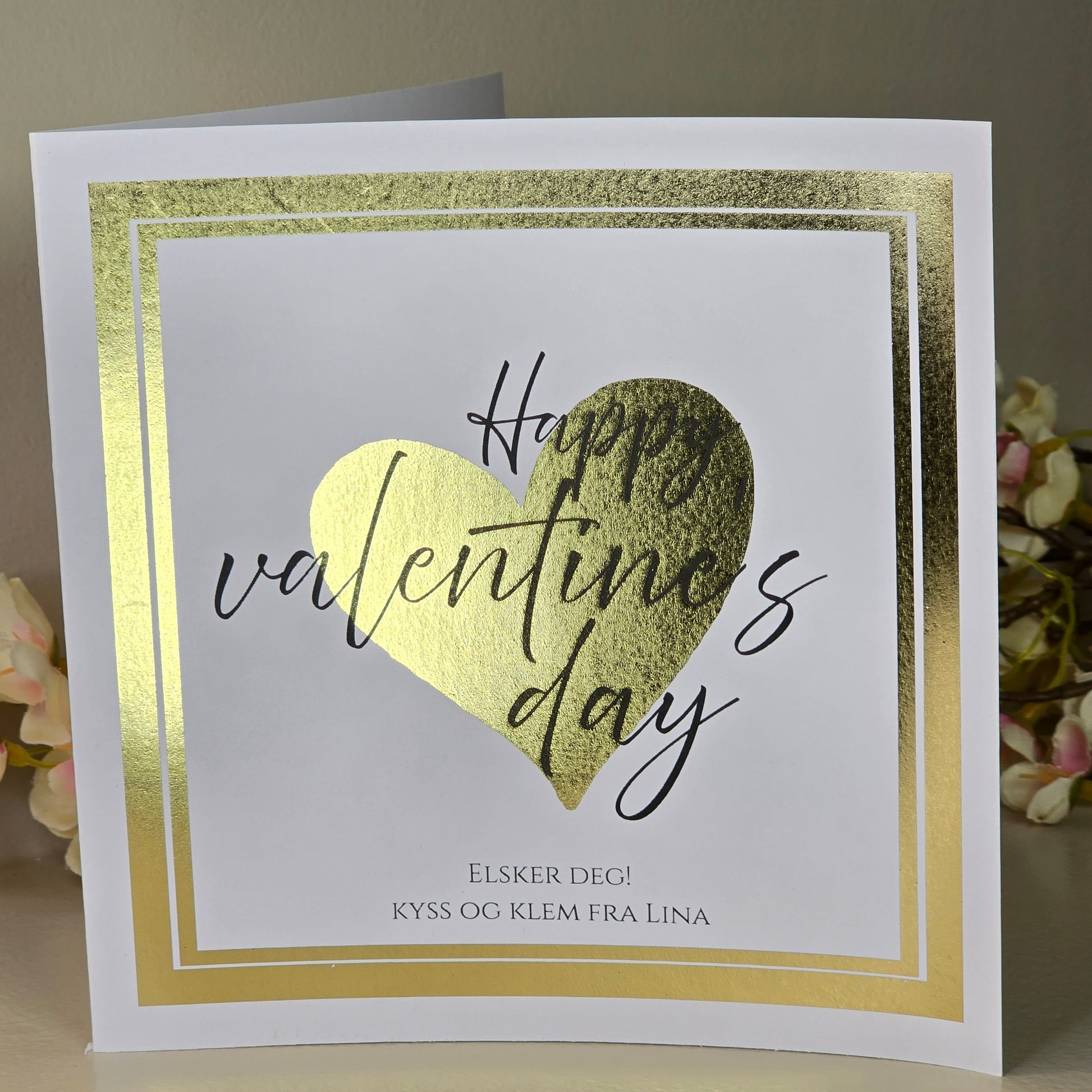 Et elegant valentines kort med ramme og hjerte i gullfolie, med personlig hilsen på forsiden.