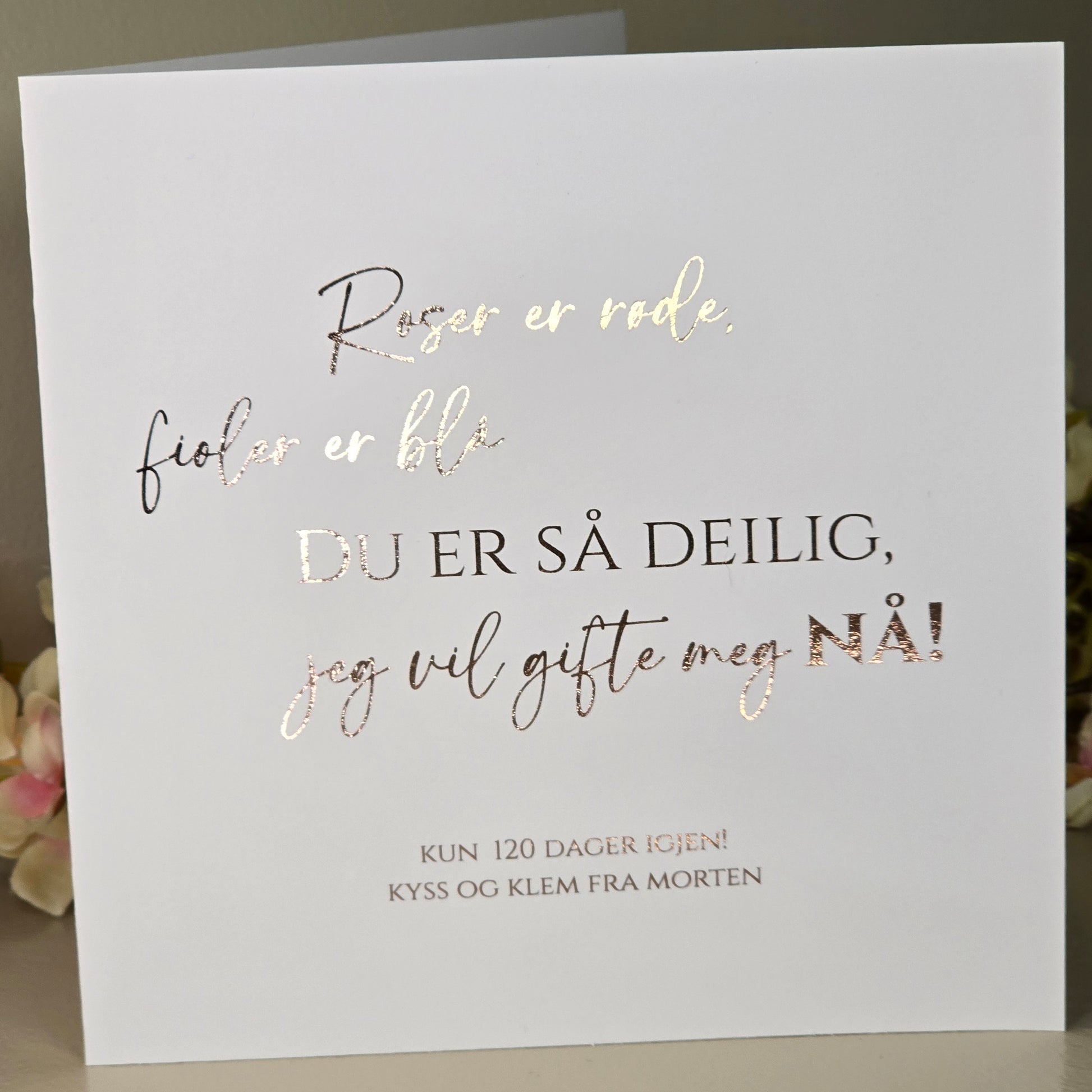 Teksten er trykket med valgfri folie, som gir kortet et eksklusivt uttrykk.